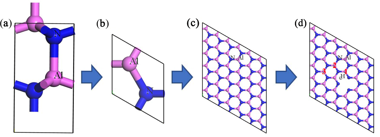 模型 (a) AlN 原胞; (b) 单层 AlN 原胞; (c) 单层 AlN 超胞; (d) 单层 Al35HiN36 和 Al34HiMN36 (M = Be, Mg, Ca)。图中1、2、3表示M(Be、Mg、Ca)和VAl的相对位置