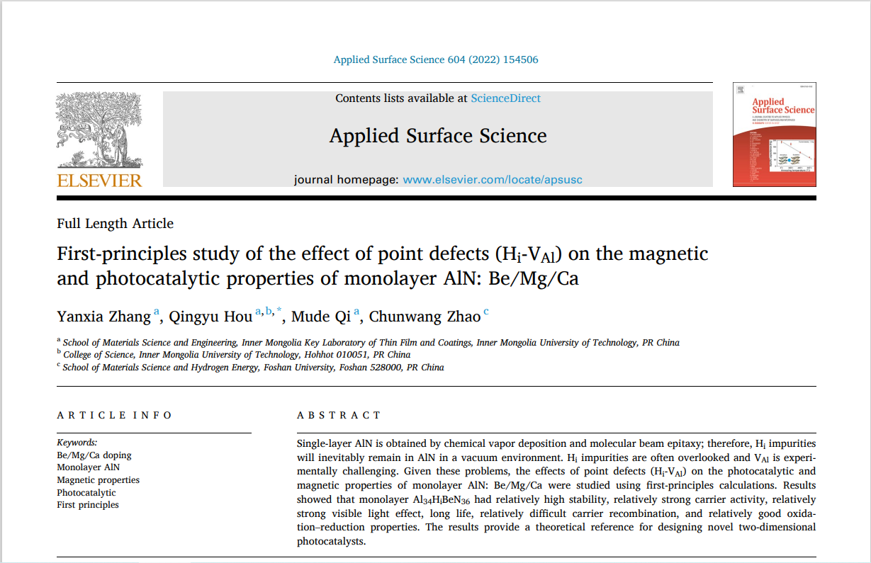相关研究以“First-principles study of the effect of point defects (Hi-VAl) on the magnetic and photocatalytic properties of monolayer AlN: Be/Mg/Ca) ”为题,于8月11日在线发表于期刊《Applied Surface Science》 (一区,IF:7.392) 上。侯清玉教授为该文章通讯作者,材料科学与工程学院2021级博士研究生张彦霞为第一作者,优米APP网址材料科学与工程学院为第一完成单位。