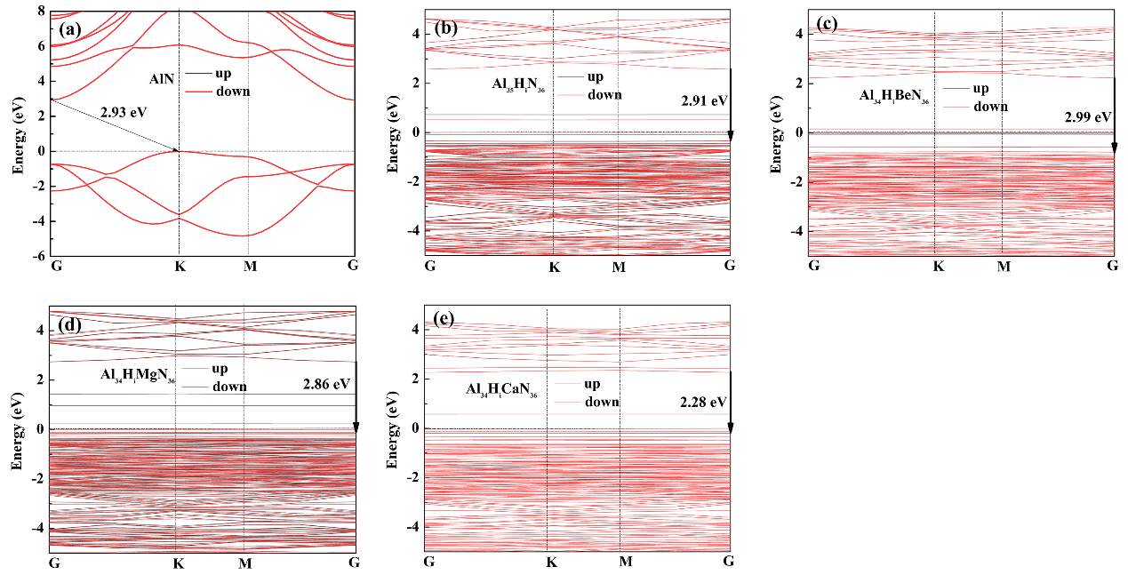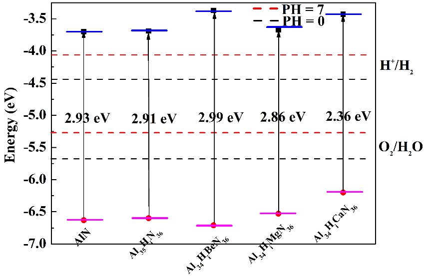 基于上述考虑,侯清玉教授团队通过第一性原理计算方法,系统研究了点缺陷(Hi-VAl)对单层AlN:Be/Mg/Ca磁性和光催化性能的影响,从态密度和能带的计算表明,所有含杂质体系均为直接带隙半导体。同时发现,单层Al34HiMN36体系满足杂质能级与费米能级重合或在其附近有利于陷阱作用,电子与空穴不易复合,载流子寿命相对最长。