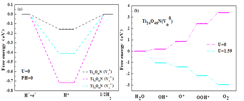 电催化结果表明,氢自由能相对最小,有利于分解水析氢反应。析氧反应过电位接近零,四个电子反应过程均为下坡,有利于析氧反应分解水制氧。电催化H的自由能和O的自由能分别如图3a、3b所示。2D-Ti24O46N (Vo0)体系是理想的新型电催化剂候选者之一。本研究收到审稿专家的高度评价和认可。