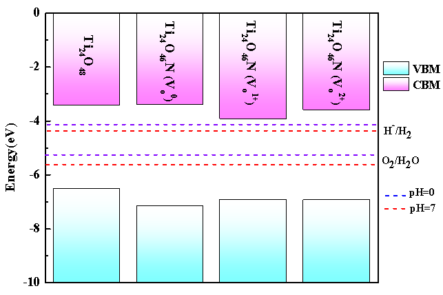 纯的体相锐钛矿TiO2利用太阳光较低,量子效率低且寿命短,电催化解离水析氧和析氢效率低。二维锐钛矿TiO2(001)表面对光电催化有一定的优势。因此,侯清玉教授课题组用第一性原理GGA+U的方法,研究了不同价态Vo和N掺杂共存对TiO2(001)表面体系的光电催化性能的影响。首先,研究发现, 2D-Ti24O46N (Vo0)体系稳定性高,功函数低,载流子活性好,电子-空穴寿命长,红移好,氧化能力强(图2所示)。2D-Ti24O46N (Vo0)体系光催化分解水析氧最有利。