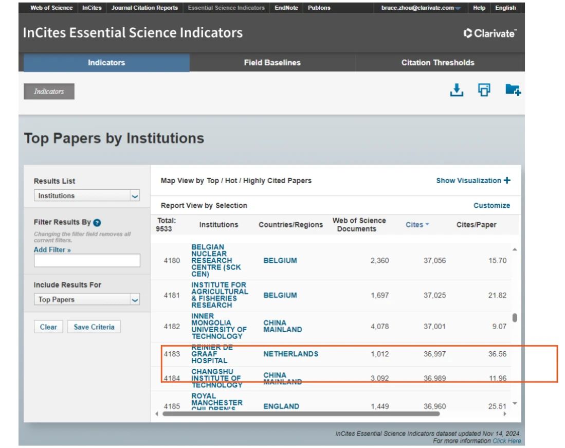 ESI(Essential Science Indicators,基本科学指标数据库)是衡量科学研究绩效、跟踪科学发展趋势的基本分析评价工具,基于科睿唯安Web of Science(SCIE/SSCI)所收录的全球12000多种学术期刊的1000多万条文献记录而建立的计量分析数据库,主要通过论文数、论文被引频次、论文篇均被引频次、高被引论文、热点论文等指标,以学术论文产出为基础对国家和地区科研水平、机构学术声誉、科学家学术影响力以及期刊学术水平进行全面衡量,是当今世界范围内普遍用以评价高校、学术机构、国家及地区国际学术水平及影响力的重要评价指标工具之一。