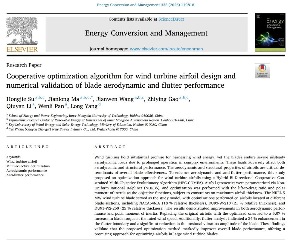目前,该研究成果受到国家自然科学基金No.52366017、No.51966014;内蒙古科技计划项目No.2021GG0436;内蒙古自然科学基金项目No.2023MS05003;内蒙古高校“青年科技英才”项目No. NJYT23021;内蒙古自治区直属高校基本科研业务费项目No.JY20240059支持。相关研究文章“Cooperative optimization algorithm for wind turbine airfoil design and numerical validation of blade aerodynamic and flutter performance”(DOI: https://doi.org/10.1016/j.enconman.2025.119818)在国际期刊Energy Conversion and Management》(中国科学院一区TOP,IF:9.9)发表我校2021级博士研究生苏宏杰为第一作者,马剑龙教授为通讯作者,我校为论文第一单位和唯一通讯单位。