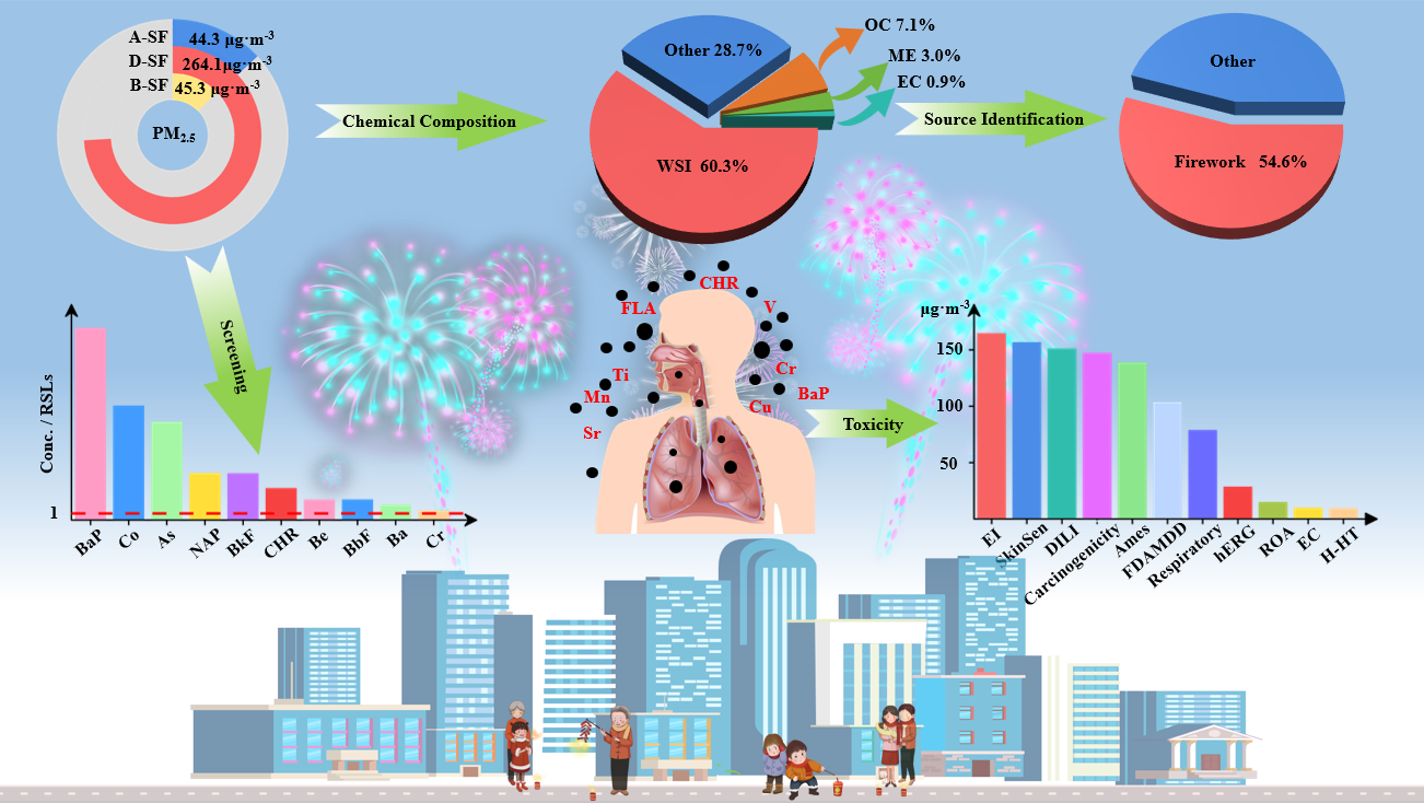 烟花爆竹燃放导致空气质量短期恶化,但烟花源气溶胶关键组分对人体健康的毒性风险尚不明确。本研究基于正交矩阵因子(PMF)模型量化了春节期间烟花爆竹对PM2.5的贡献,通过定量构效关系和区域筛选水平评估了烟花源气溶胶关键组分的毒性水平,重点预测了PAHs的11种毒性当量并筛查出主导因子研究成果为烟花燃放控制和空气质量改善政策制定提供了重要参考。