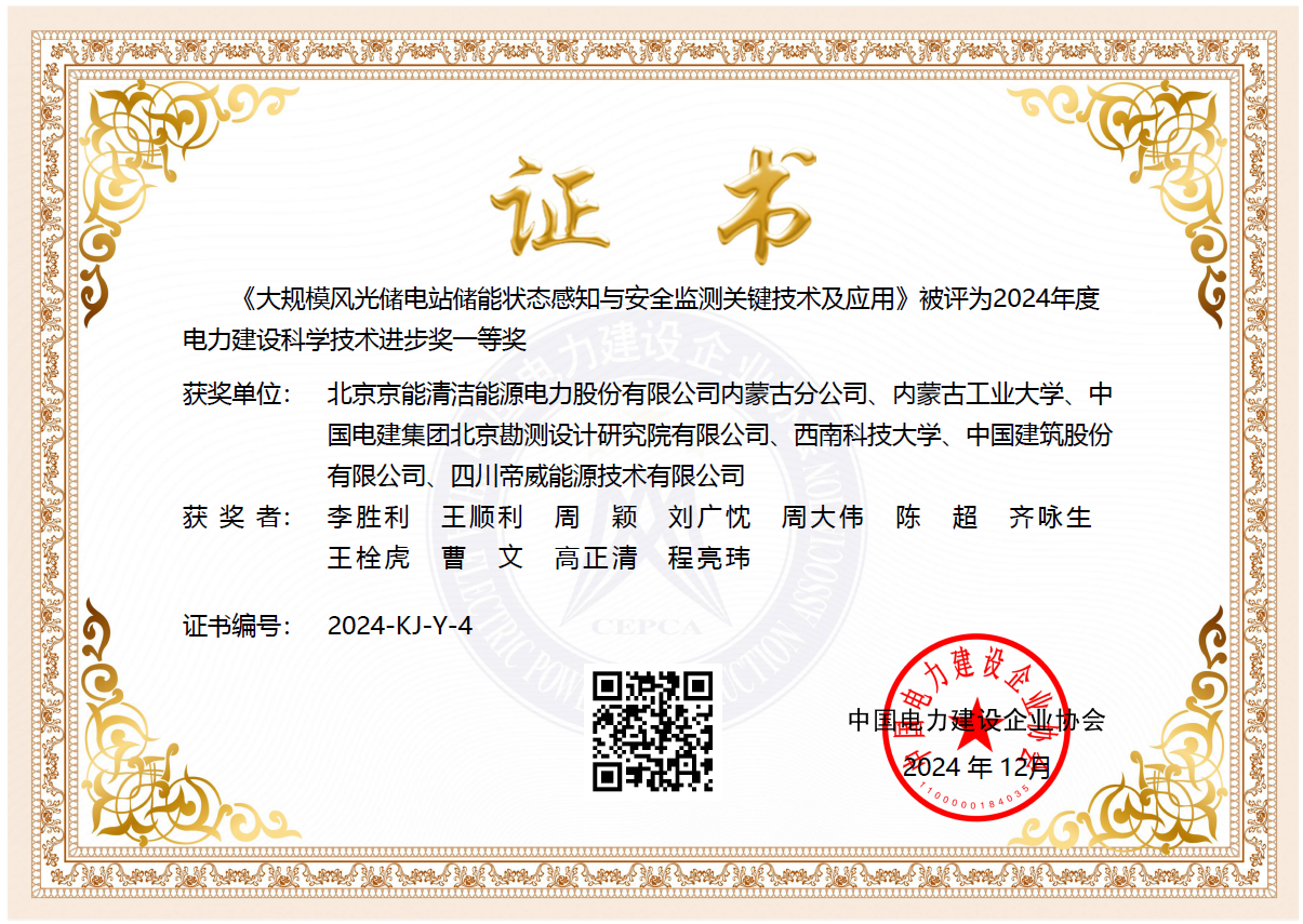 近日,中国电力建设企业协会公布 2024 年电力建设科学技术进步奖评审结果,经形式审查、网络专业初审、评审委员会评审,我校电力学院王顺利教授团队联合北京京能清洁能源电力股份有限公司内蒙古分公司等单位共同研发的《大规模风光储电站蓄能状态采集与安全监测关键技术及应用》项目荣获2024年度电力建设科学技术进步奖一等奖。