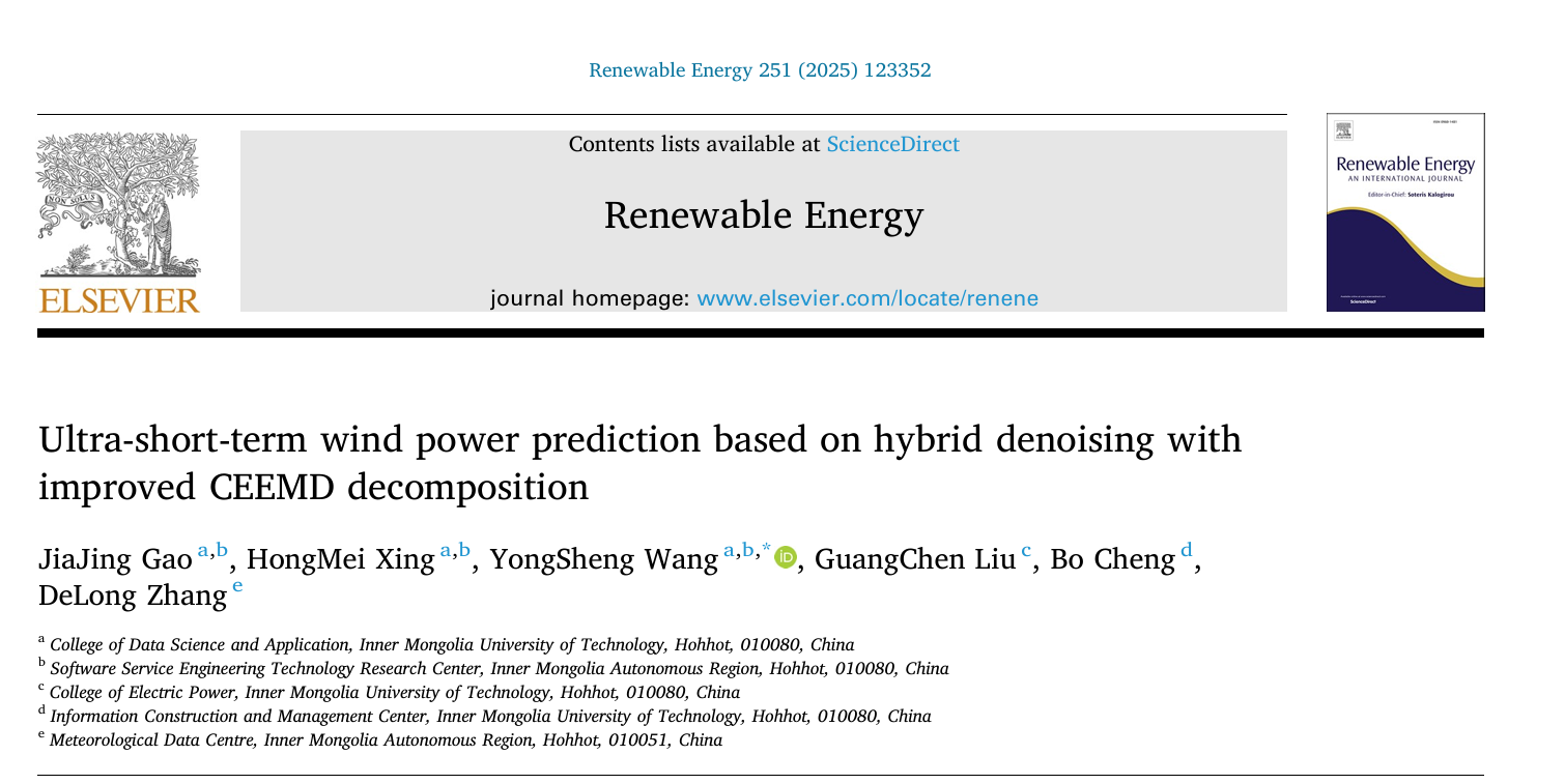 该研究成果受到国家自然科学基金(No. 62366039)、内蒙古自治区科技项目(No. 2023YFSH0066)及内蒙古高校科研项目(No. JMZD202301)资助。相关成果以“Ultra-short-term wind power prediction based on hybrid denoising with improved CEEMD decomposition”为题在国际期刊Renewable Energy上发表。我校2023级硕士研究生高嘉婧为该论文第一作者,数据科学与应用学院王永生教授为该论文通讯作者,优米APP网址数据科学与应用学院为该论文第一完成单位。