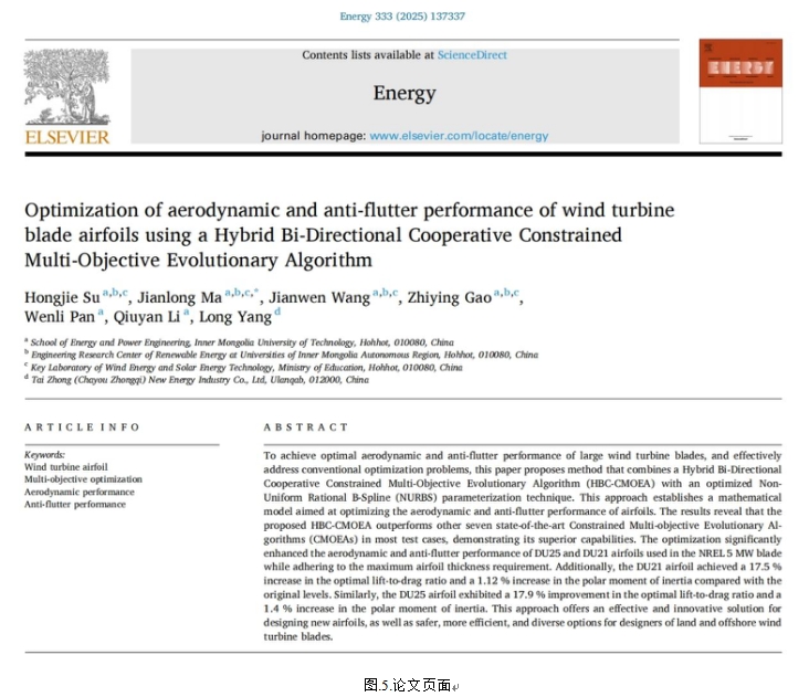该研究成果受到国家自然科学基金(No.52366017、No.51966014);内蒙古科技计划项目(No.2021GG0436);内蒙古自然科学基金项目(No.2023MS05003);内蒙古高校“青年科技英才”项目(No. NJYT23021);内蒙古自治区直属高校基本科研业务费项目(No.JY20240059)支持。相关研究文章“Optimization of aerodynamic and anti-flutter performance of wind turbine blade airfoils using a Hybrid Bi -Directional Cooperative Constrained Multi-Objective Evolutionary Algorithm”(DOI: https://doi.org/10.1016/j.energy.2025.137337)在国际期刊《Energy》(中国科学院一区TOP,IF:9.4)发表,马剑龙教授为通讯作者,第一作者为该团队的博士研究生,我校为论文第一单位和唯一通讯单位。