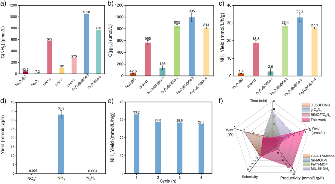 图3 a)具有(110)/(211)的不同峰强度比的ZIF67-D(在图中,ZIF67-D由Co表示)以及具有和不具有碳层的催化剂光催化活性,b) 光催化固氮产率,c)光催化固氮活性,d)光催化固氮副产物,e)光催化固氮循环性能,以及f) 通过与最近PNRR的高性能的相关文献进行比较来评价这项工作