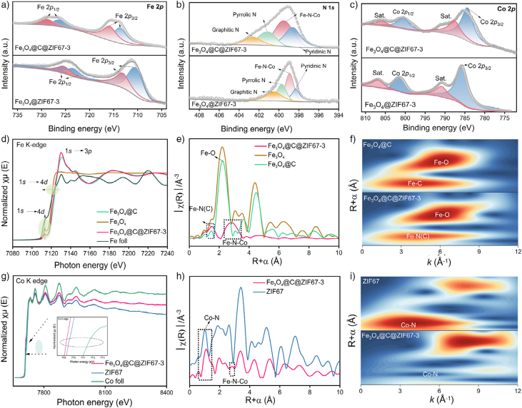 图2 Fe3O4@ZIF67-3和Fe3O4@C@ZIF67-3的高分辨率XPS光谱a) Fe 2p,b) N 1s和c) Co 2p。d)和g) EXAFS光谱揭示 Fe、Co K edge和e)和h) Fe3O4@C@ZIF67-3、ZIF67和Fe3O4@C. f)的相应FT-EXAFS光谱和i) EXAFS的小波变换