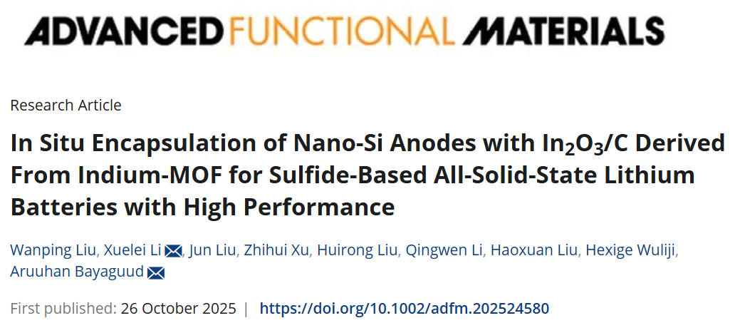 该研究工作得到内蒙古自治区自然科学基金(2025MS02004)、一级学科科研专项(YLXKZX-NGD-029和YLXKZX-NGD-002)的资助。相关研究成果“In-situ encapsulation of nano-Si anodes with In2O3/C derived from indium-MOF for sulfide-based all-solid-state lithium batteries with high performance在国际权威期刊Advanced Functional Materials》(中国科学院一区TOP,IF:19)上在线发表。我校材料科学与工程学院阿如罕教授李学磊副教授论文通讯作者,我校材料科学与工程学院2025级博士研究生刘万平为论文第一作者,我校为论文唯一通讯单位