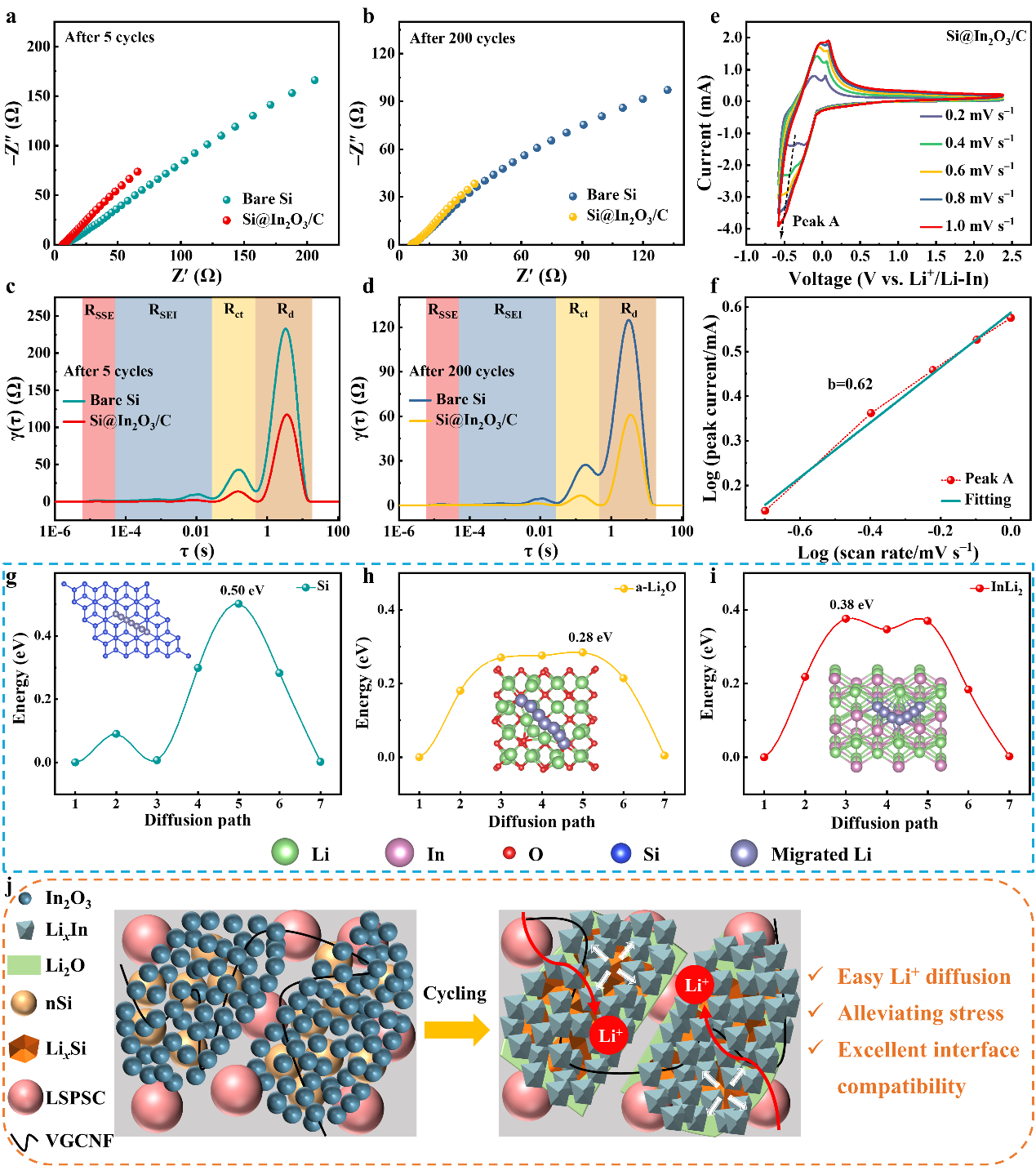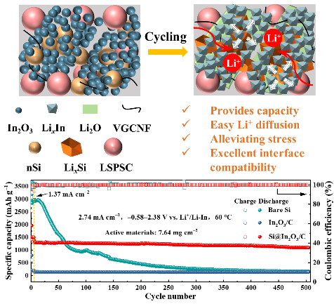 硅(Si)作为硫化物基全固态锂电池(ASSLBs)的负极材料显示出优异的潜力同时面临电子电导率低循环期间体积变化大导致循环寿命短固有挑战研究利用铟基金属有机骨架(In-MOF)衍生In2O3/C对Si颗粒进行原位封装。经锂化后In2O3/C原位形成的Li-In合金和Li2O提供了快速Li⁺传输特性,并有效地缓冲Si的严重体积变化。该研究为硫化物基ASSLB负极材料的设计提供新思路。