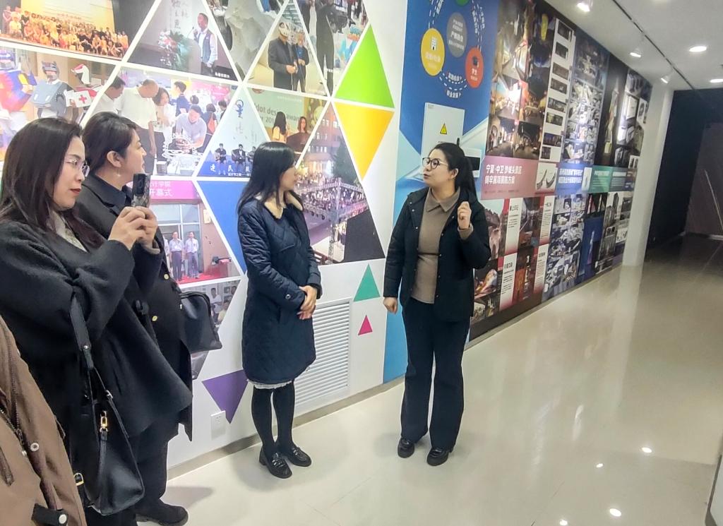 在全国民族团结进步模范单位教育基地、设计学院教育教学成果展厅,学院书记孙晶介绍了学院将“立德树人”融入思政育人、专业教学、科技创新,开展铸牢中华民族共同体意识教育的创新举措。