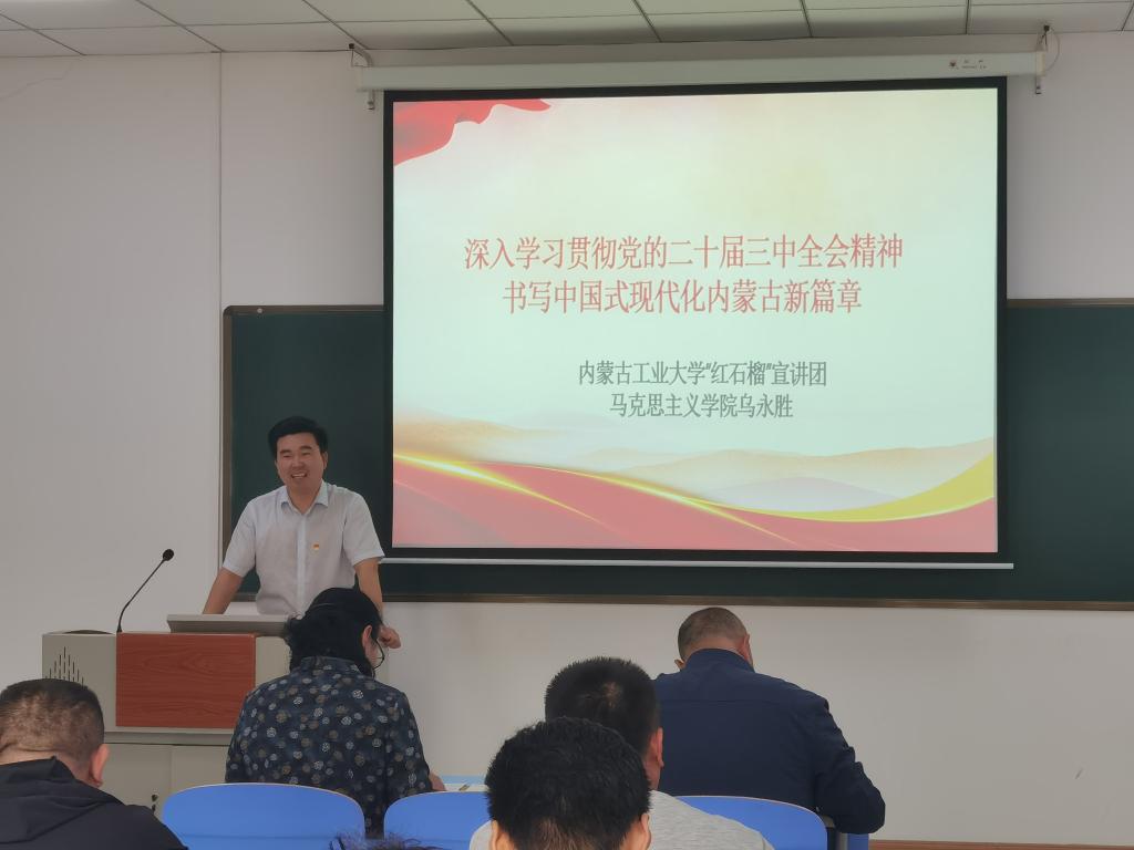 为了进一步深入学习贯彻党的二十届三中全会精神,9月29日,工程训练教学部党总支邀请学校“红石榴”宣讲团成员乌永胜老师“深入学习贯彻党的二十届三中全会精神 书写中国式现代化内蒙古新篇章”主题宣讲,工程训练教学部全体教职工参加。