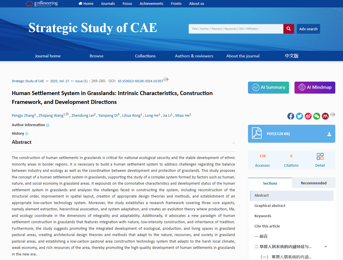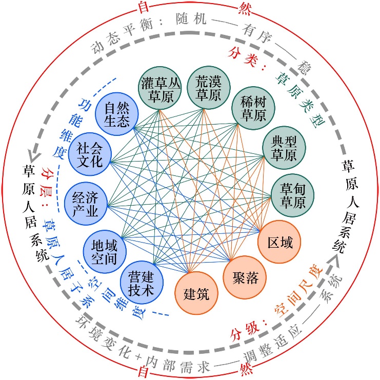 学术论文草原人居系统:内涵特征、构建框架与发展方向》研究提出了草原人居系统概念,支持研究草原地区的人、自然环境、社会经济等因素叠加形成的复杂系统;阐释了草原人居系统的内涵特征与发展现状,分析了草原人居系统建设面临的结构秩序有待重构、空间布局有待改善、适宜设计理论与方法缺乏、适宜低碳技术体系缺失等挑战;构建了涵盖要素提取、层级关联、系统互适3个核心方面的研究框架,提炼形成“三生—适洽”演化理论,倡导“融自然-低建造-承传统”草原人居营建的新范式。研究建议,推动草原牧区“生态-生产-生活”空间一体化发展,构建适应草原牧区“自然-资源-社会”的建筑设计理论与方法,建立适应当地严气候、弱经济、富资源背景的低碳牧区营建技术体系,推动新时期草原人居建设高质量发展。