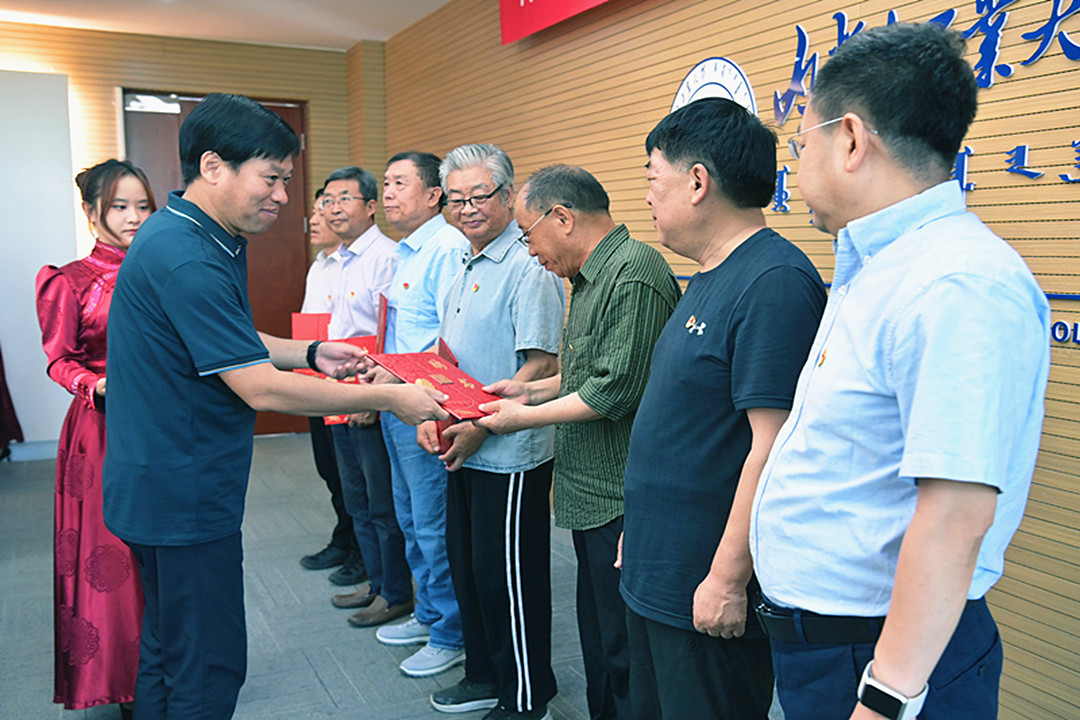 “光荣在党五十年”纪念章是党中央对老党员的崇高礼赞,今年我校共有12名老党员获此荣誉。赵增武代表学校党委为5位到会老同志颁发纪念章,向他们致以崇高敬意和真诚感谢。