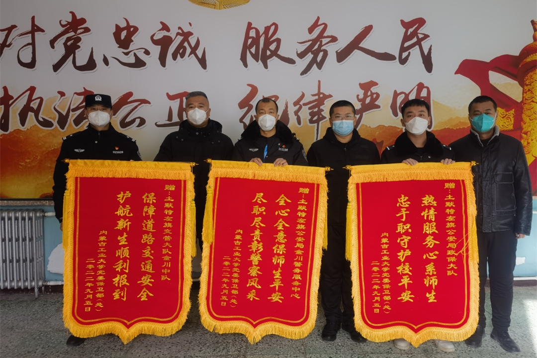 为表达对两校区属地公安机关的感谢,党委保卫部(保卫处)于2022年12月21日和2023年1月9日,分别向土默特左旗公安局政保大队、土默特左旗公安局金川警务服务中心、土默特左旗交管大队金川中队、呼和浩特市新城区公安分局海东路派出所、呼和浩特市公安局交管支队新城区大队五中队赠送锦旗,副校长郝贠洪、党委保卫部(保卫处)负责人参加赠送仪式。