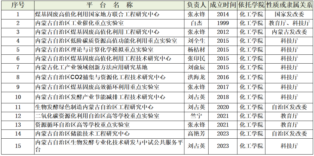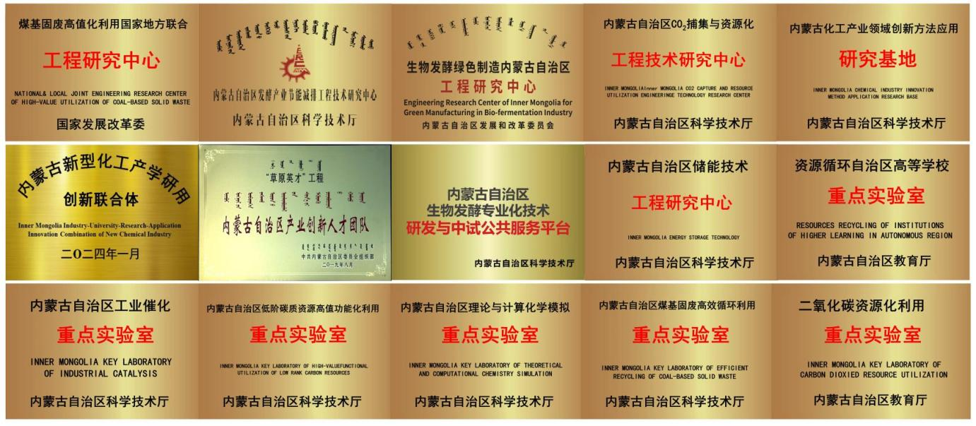 近五年承担科研项目270余项,其中获批国家级科研经费1800余万元,省部级团队及项目经费6100余万元;在国内外高水平期刊和学术会议上发表学术论文600余篇,实现了在Nature Communications、Advanced Materials、Applied Catalysis B: Environmental、Chemical Engineering Journal、Green Chemistry、Fuel等高水平学术期刊发表科研成果的常态化,其中ESI前1%和3%高被引论文2篇,以化学工程与技术学科为主体的工程学科进入学科全球ESI排名前1%;授权国家发明专利50余项、实用新型专利16项。主编标准2项、参编标准2项;出版高水平学术专著7部。在煤基固废高效循环利用、二氧化碳捕集与资源化利用、生物发酵绿色转化、新型绿色化工催化剂、新能源光电催化材料、低阶碳质资源功能化利用等方面取得重要进展。与久泰集团、博源集团、翱华设计院、中盐内蒙古化工股份有限公司、国能准能集团、天皓集团等相关企业行业建立了长期稳定的科研合作与人才培养关系,联合30余家企业建立了内蒙古新型化工产学研用创新联合体。